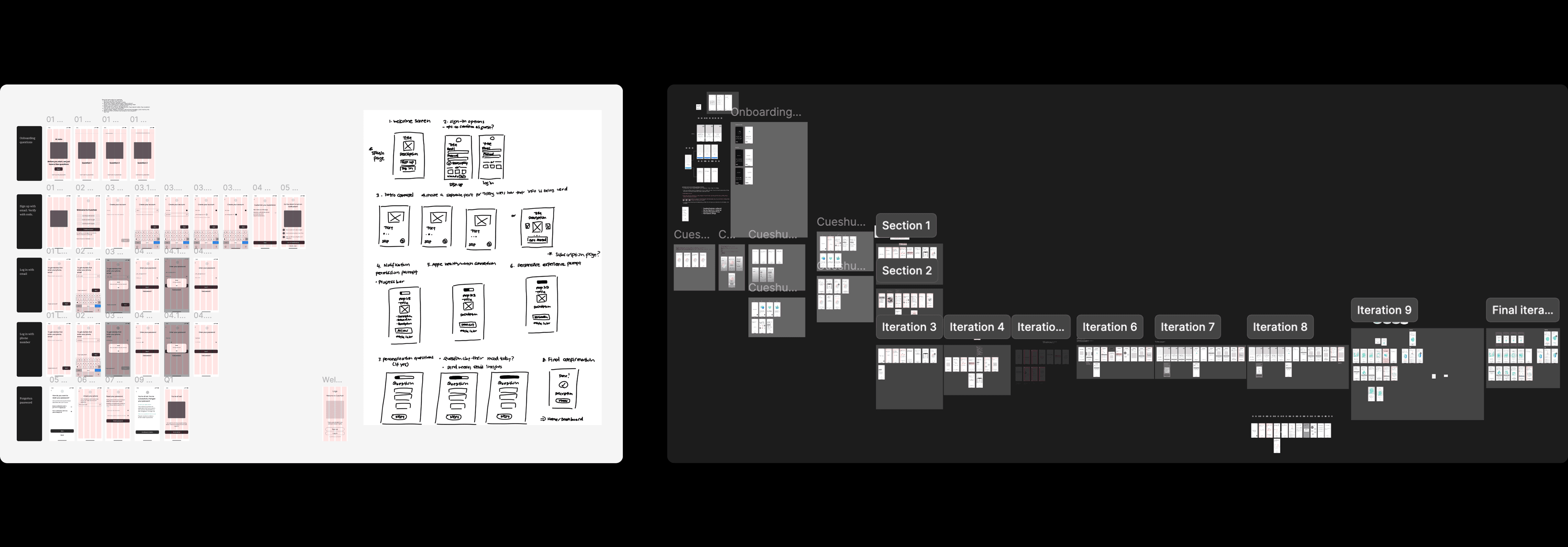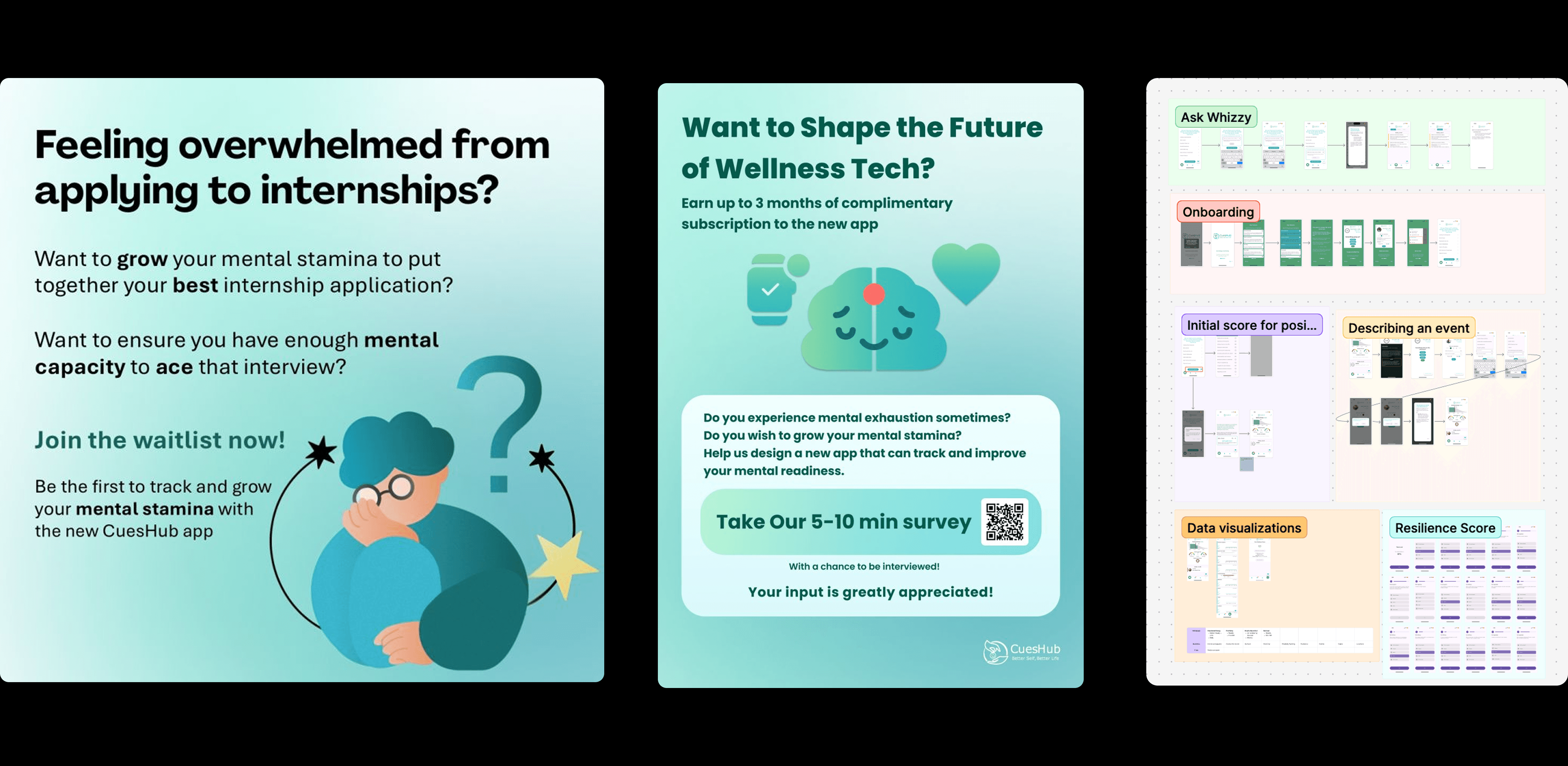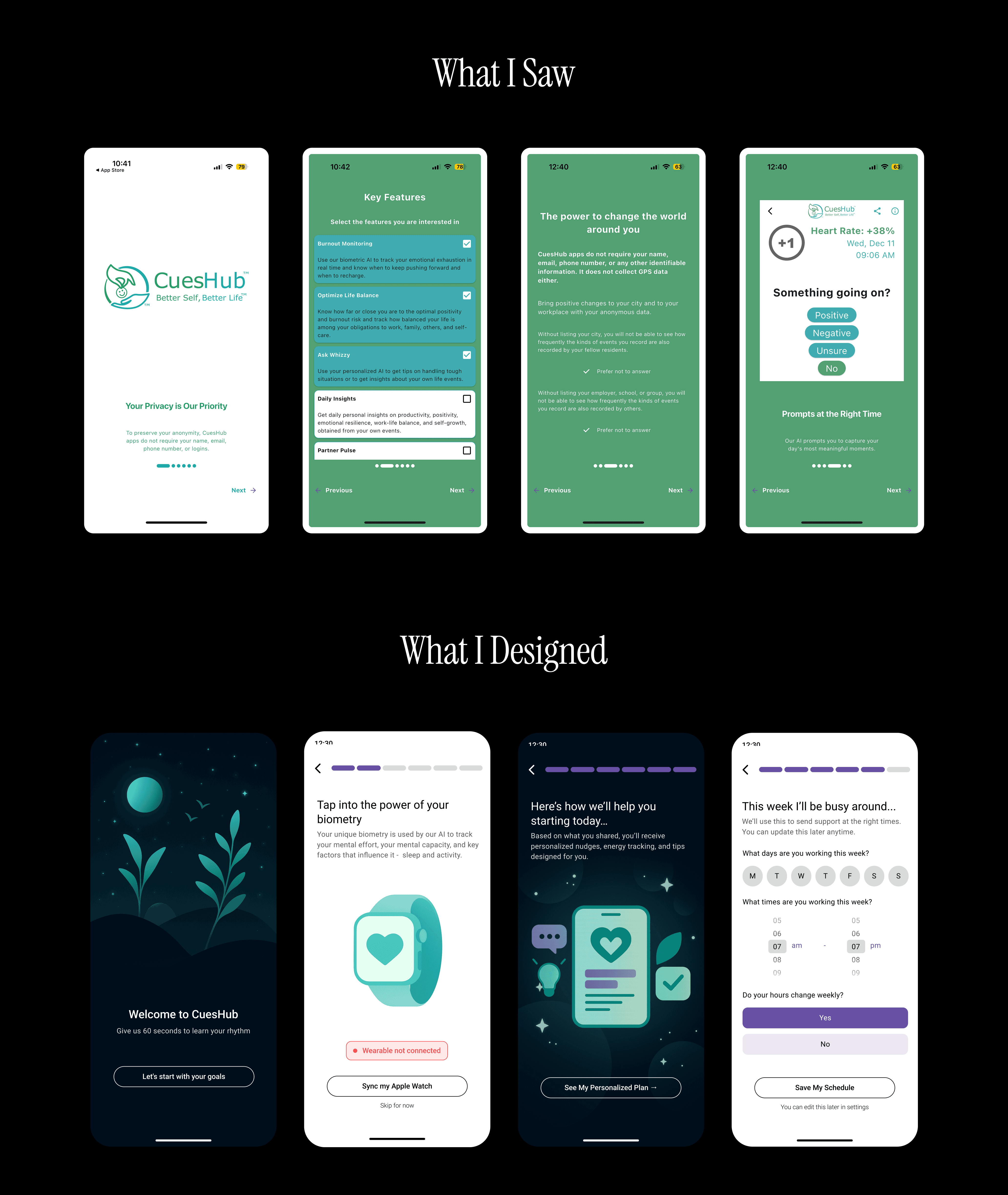 I explored different ways to help users feel guided instead of overwhelmed. From chatbot-style onboarding and story-based flows to more data-driven ideas that tie into mental wellness. Each concept focused on setting the right tone and clearly communicating what CuesHub stands for.